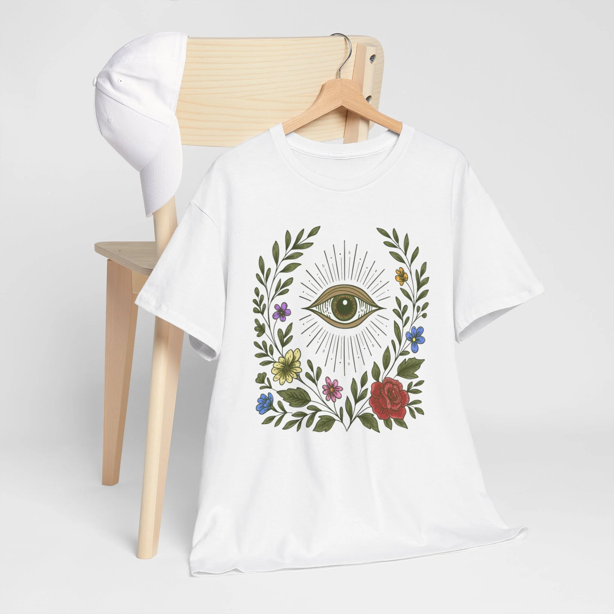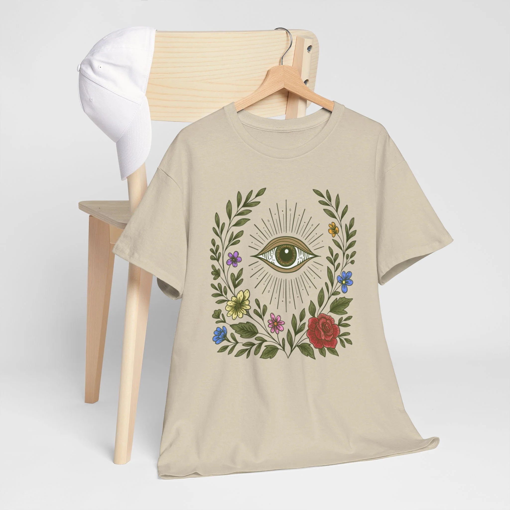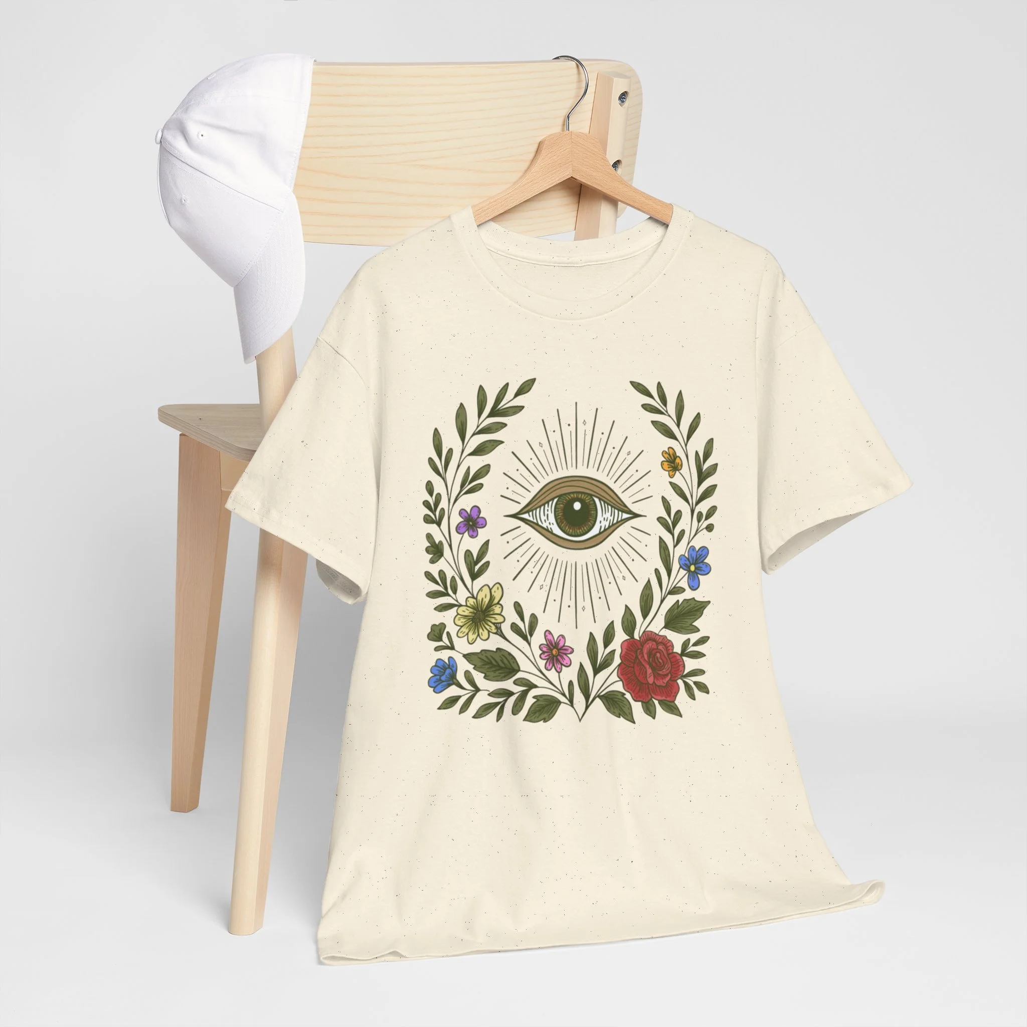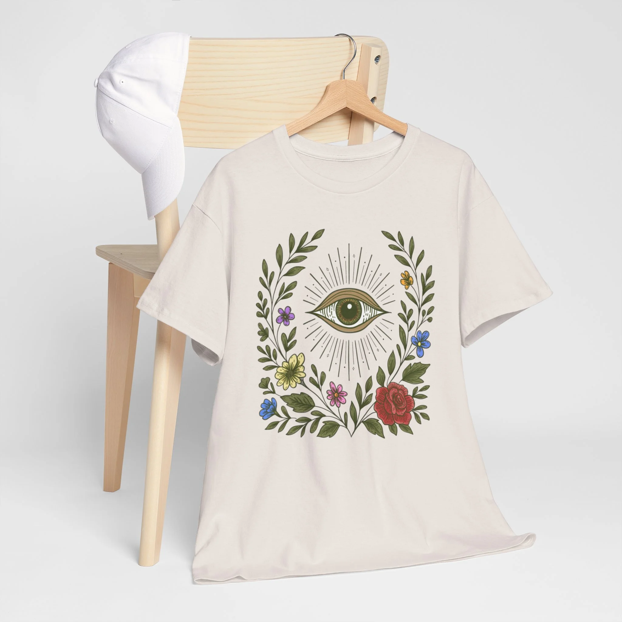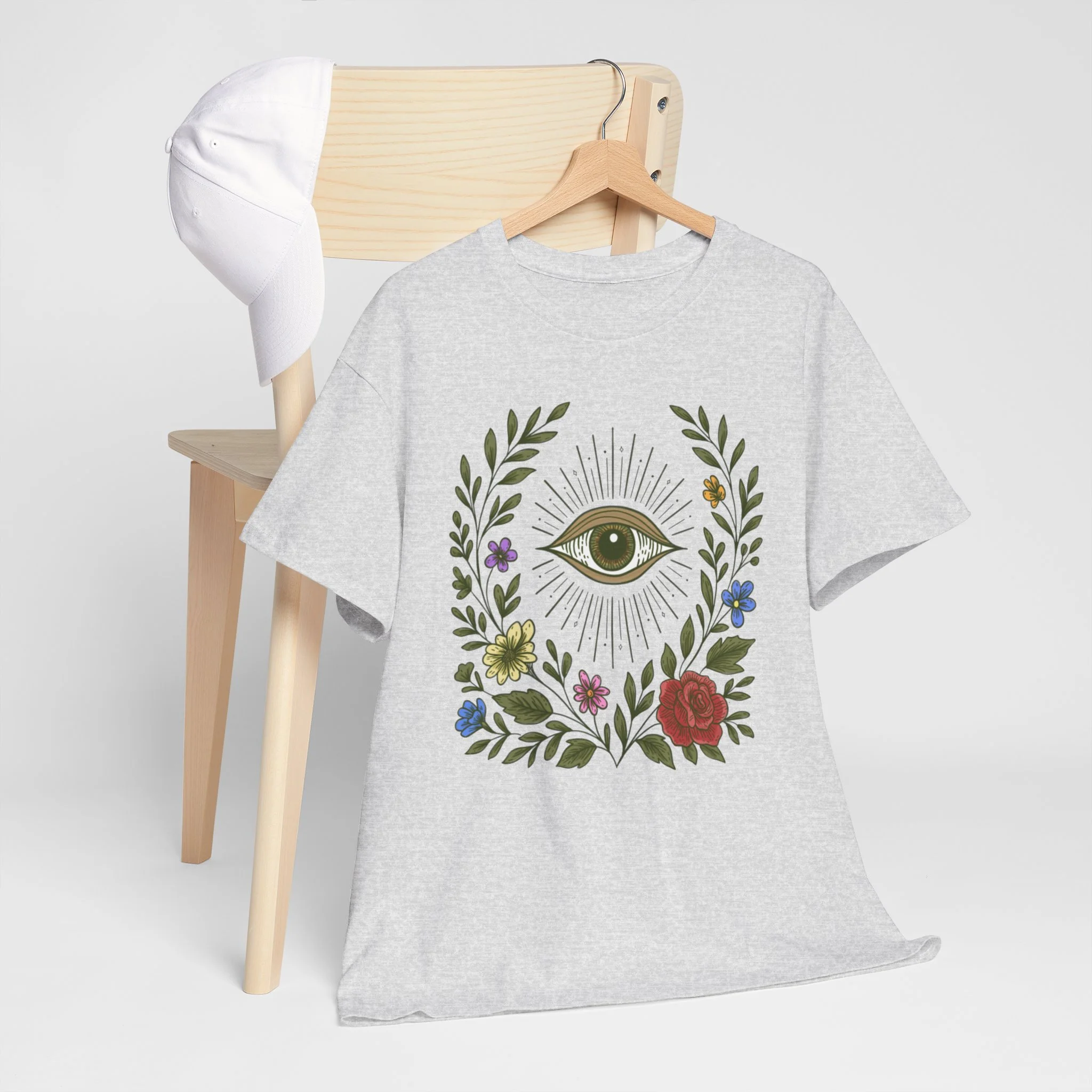 Introducing a classic Unisex Heavy Cotton Tee, perfect for expressing your unique style. This tee features a mesmerizing design that combines nature-inspired elements with an eye-catching central motif. The vibrant colors and detailed illustrations evoke a sense of wonder and connection to the natural world. Ideal for everyday wear, this tee offers comfort and versatility, making it a staple for casual outings or relaxed gatherings.