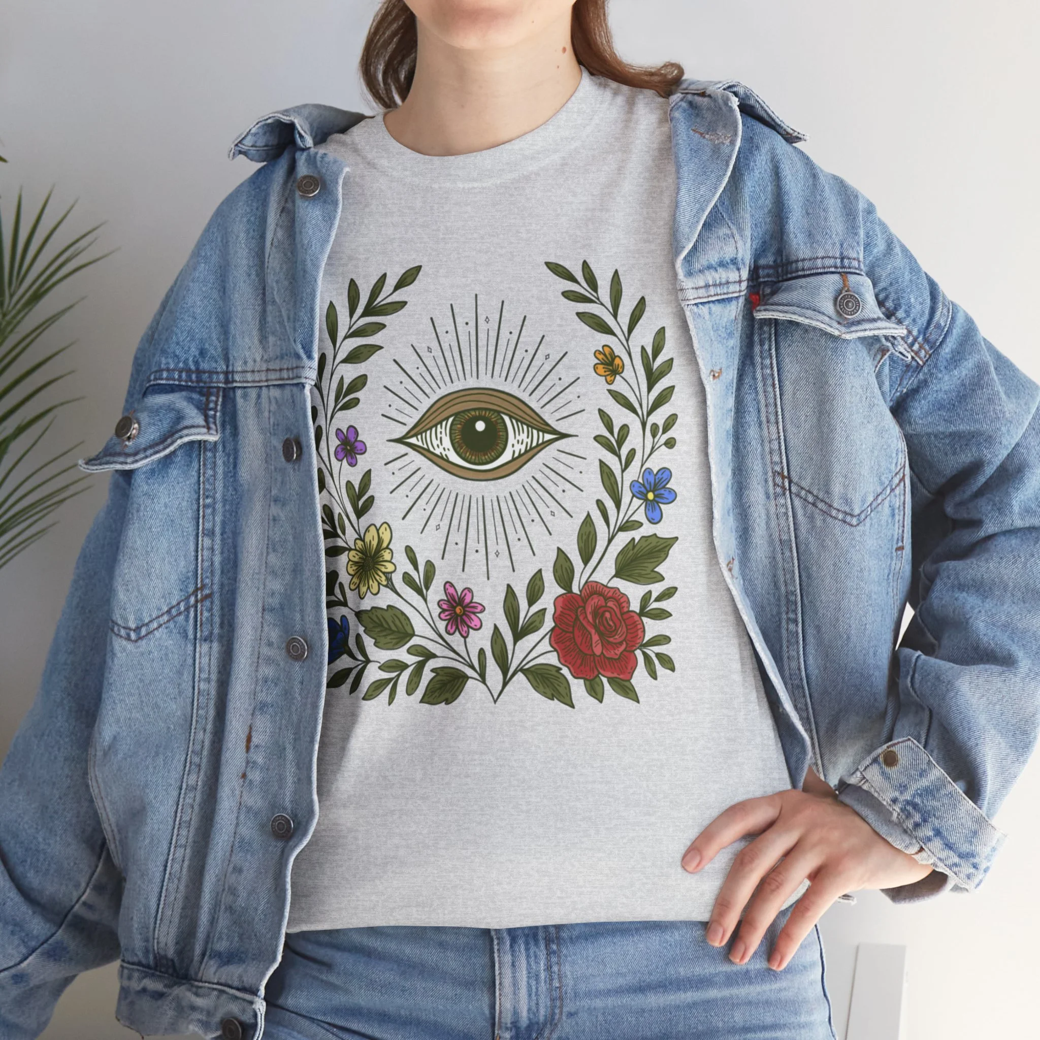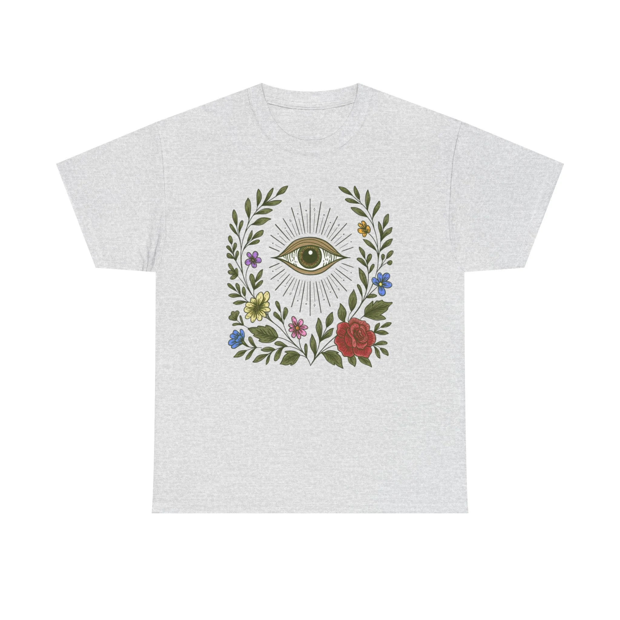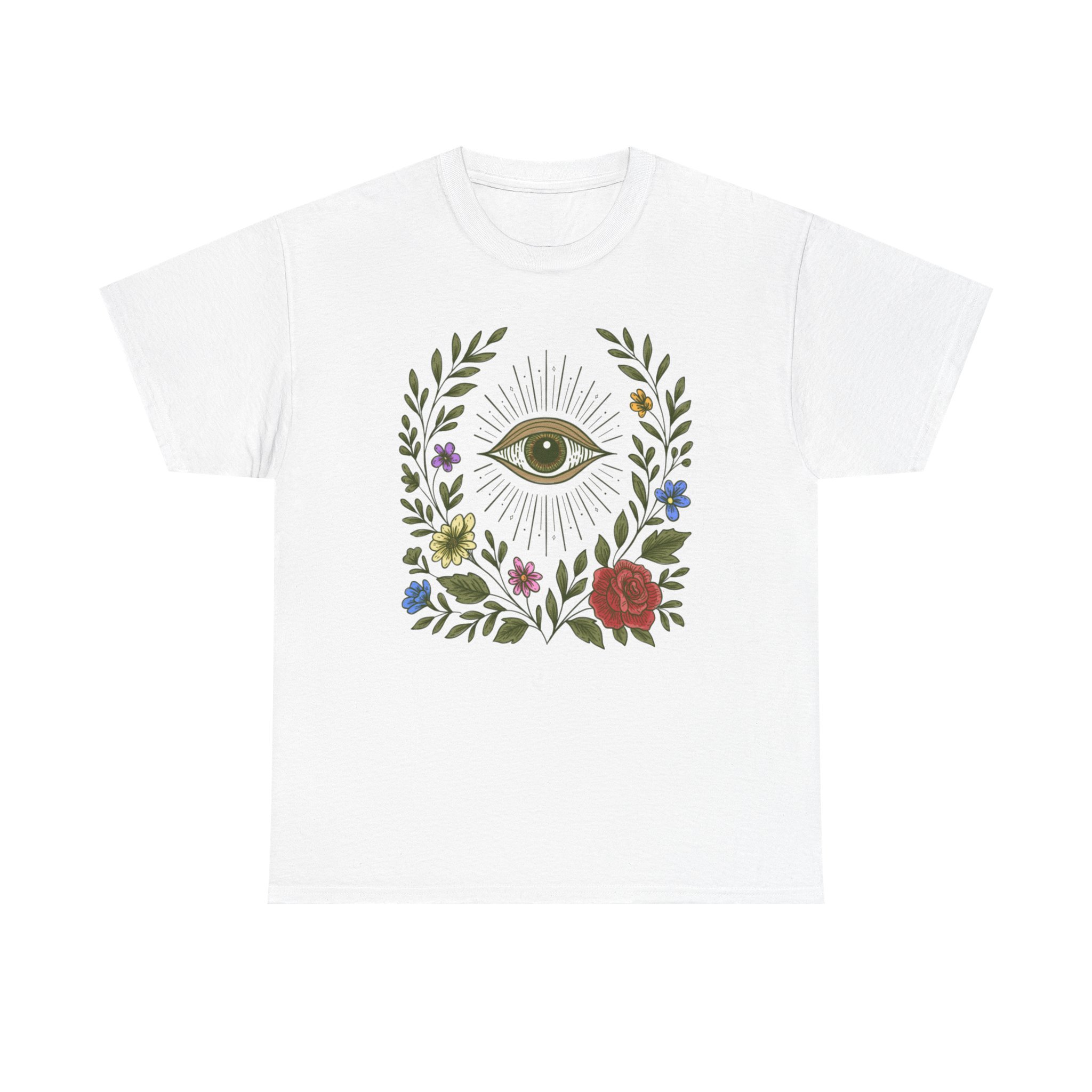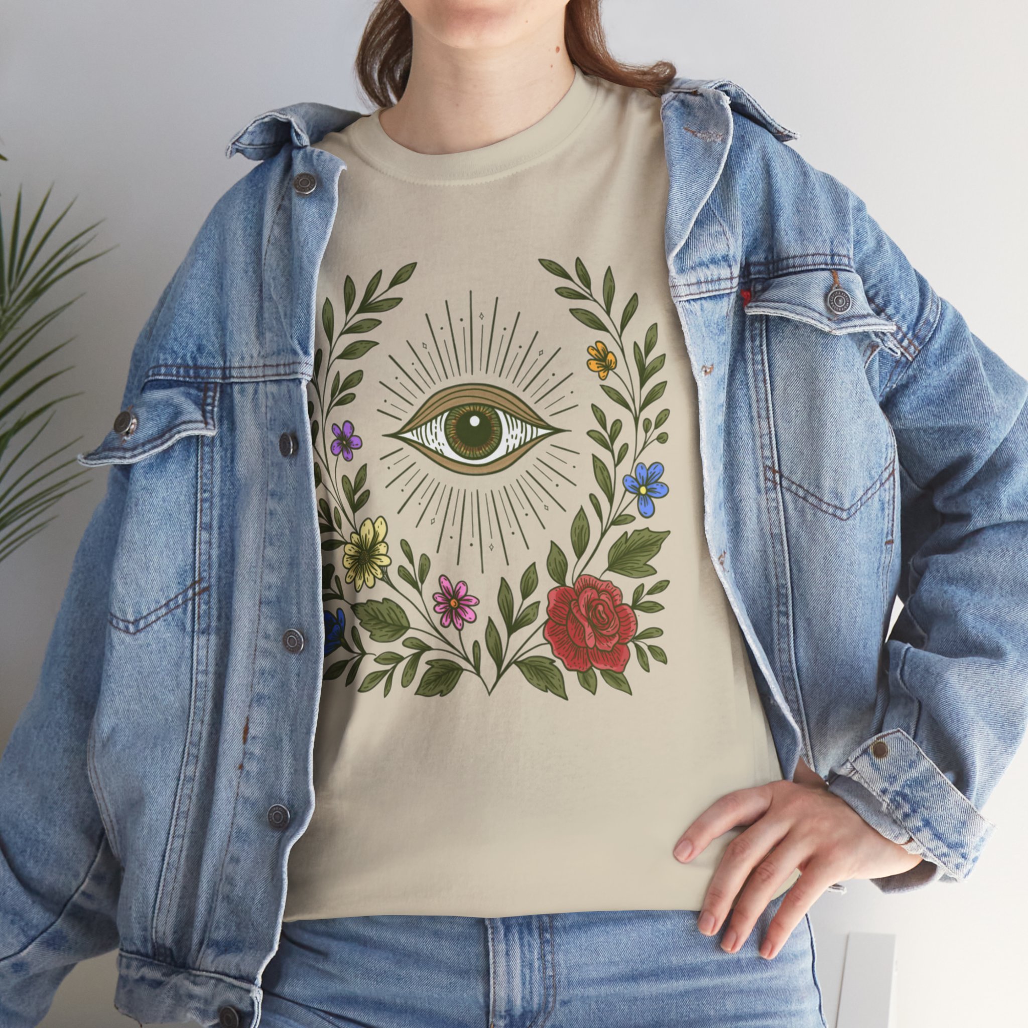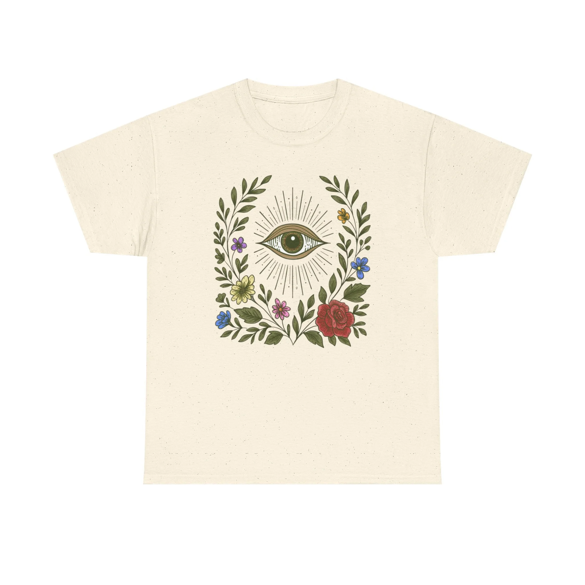 Introducing a classic Unisex Heavy Cotton Tee, perfect for expressing your unique style. This tee features a mesmerizing design that combines nature-inspired elements with an eye-catching central motif. The vibrant colors and detailed illustrations evoke a sense of wonder and connection to the natural world. Ideal for everyday wear, this tee offers comfort and versatility, making it a staple for casual outings or relaxed gatherings.