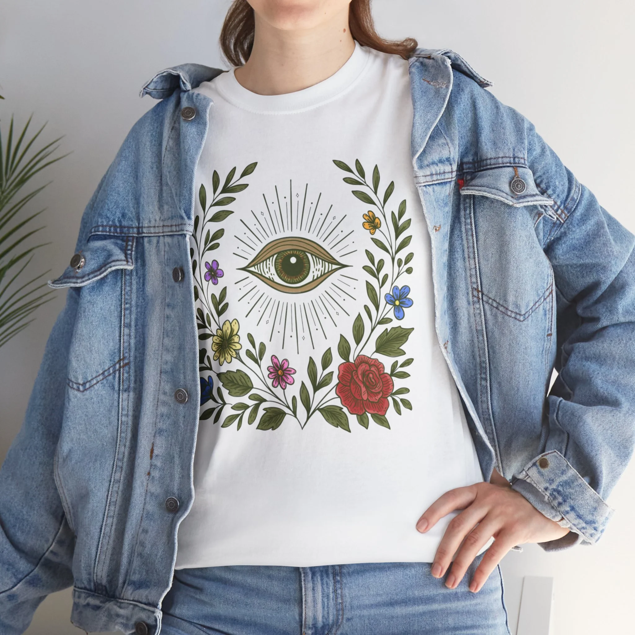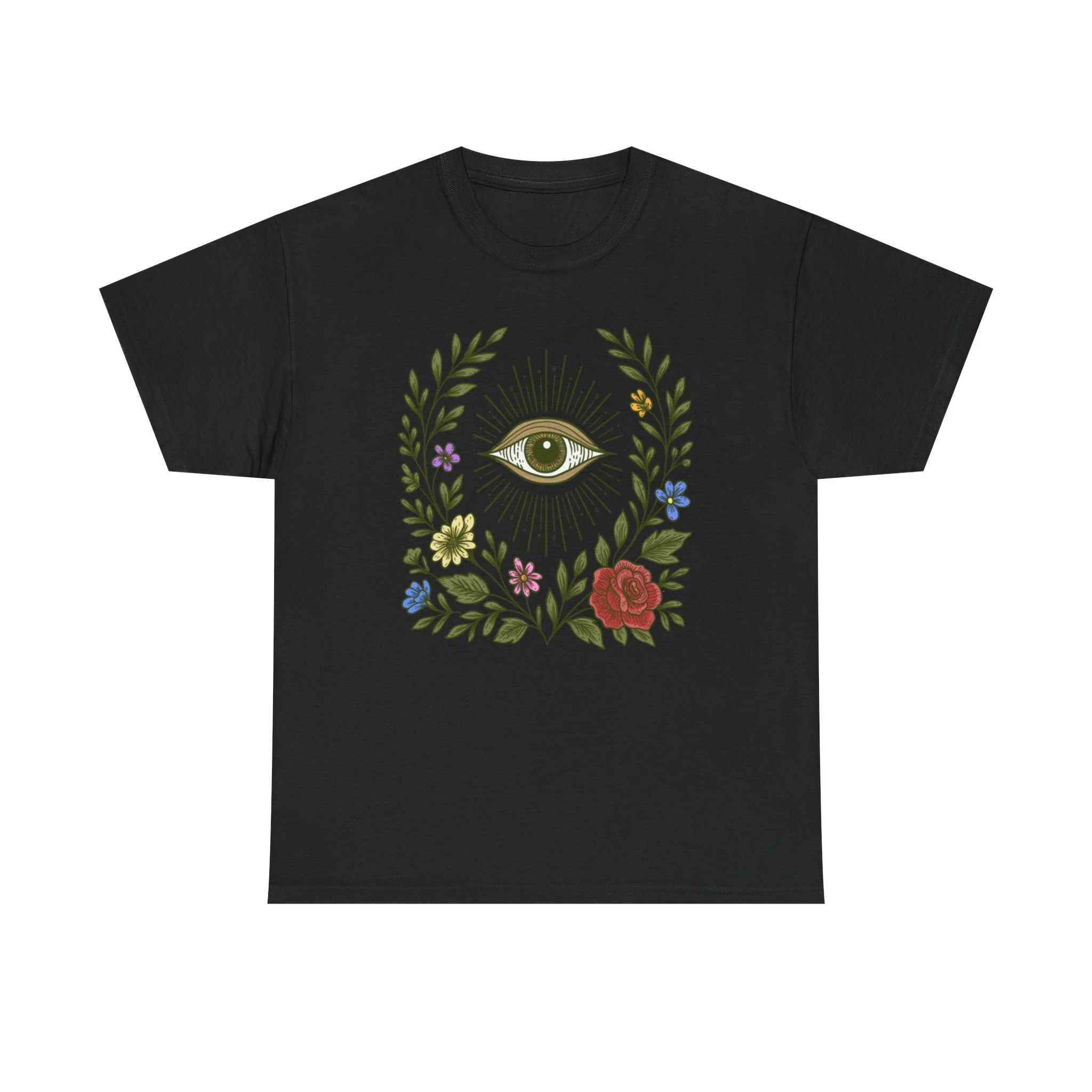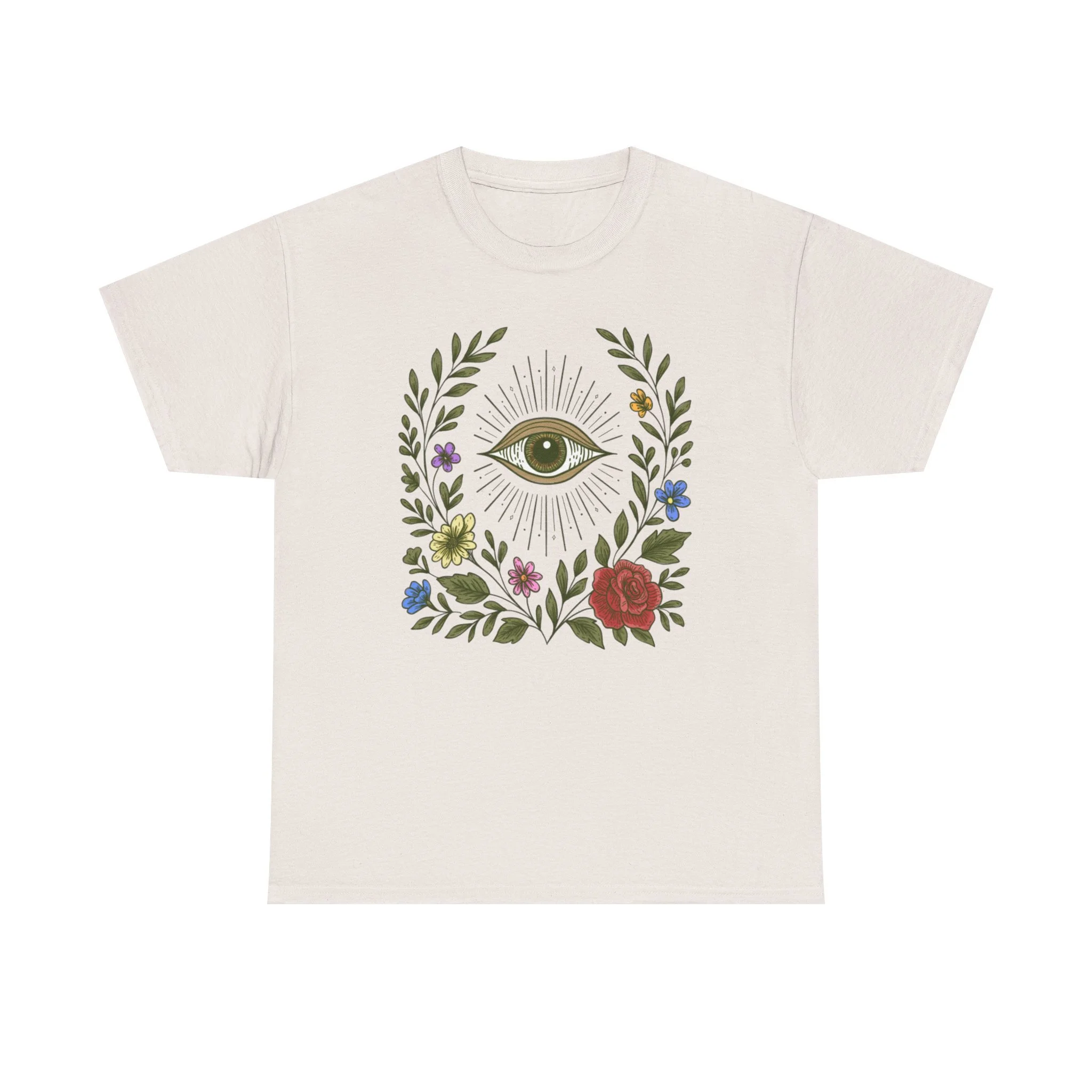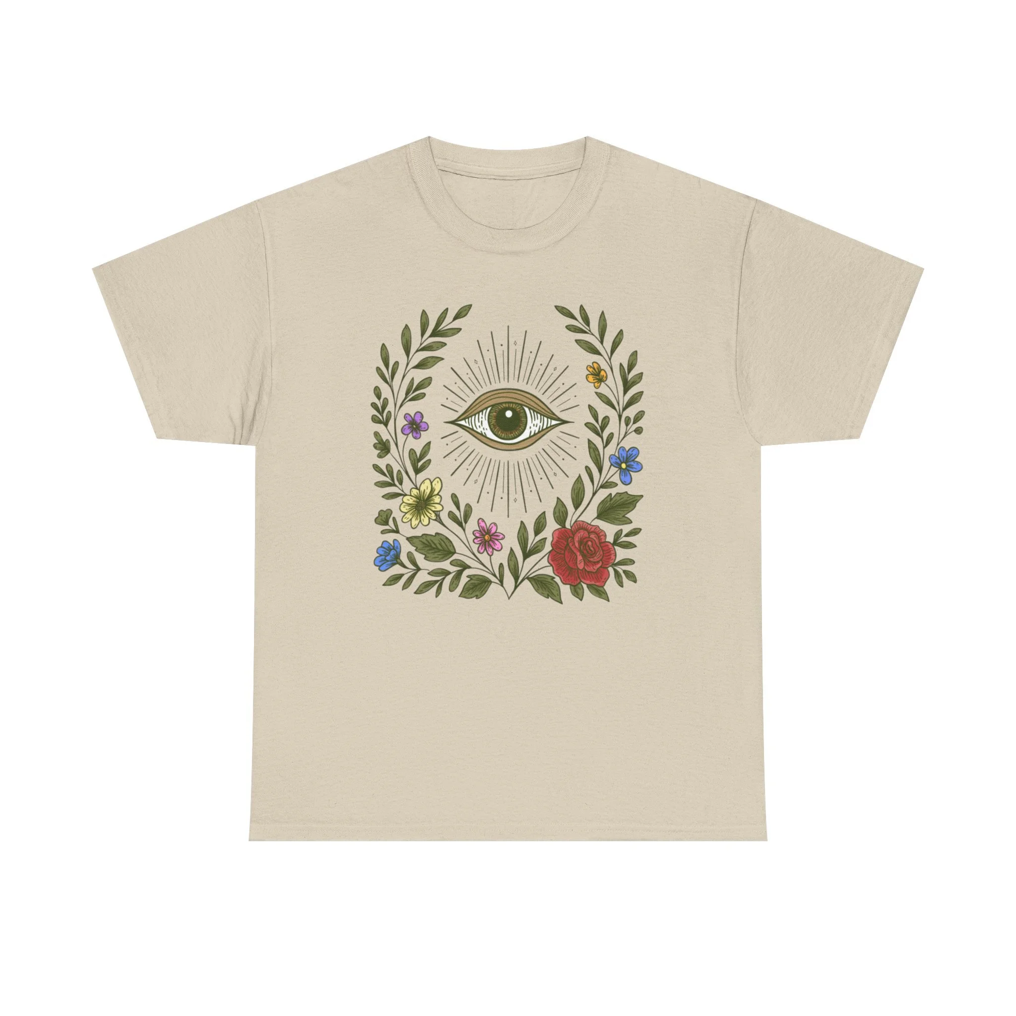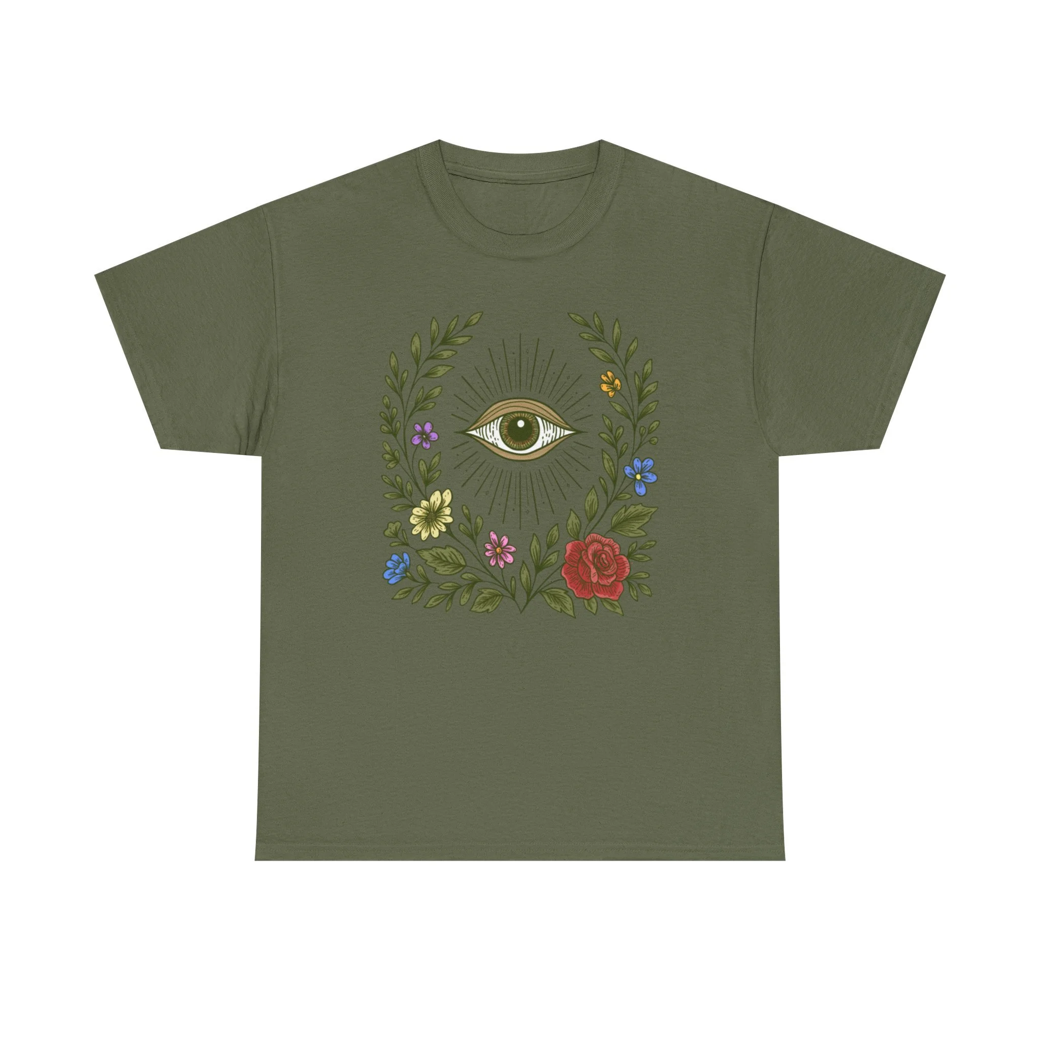 Introducing a classic Unisex Heavy Cotton Tee, perfect for expressing your unique style. This tee features a mesmerizing design that combines nature-inspired elements with an eye-catching central motif. The vibrant colors and detailed illustrations evoke a sense of wonder and connection to the natural world. Ideal for everyday wear, this tee offers comfort and versatility, making it a staple for casual outings or relaxed gatherings.